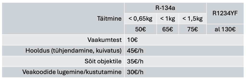 Kliimasüsteemi hooldamisel kasutatakse täisautomaatset kliimahooldusseadet Handy Plus täitegaasidele R-134a ja R1234YF. Eemaldame süsteemist vana külmaaine ja õli ning vaakumiga niiskuse. Lisame uue õli, leiame värvaine ja UV-lambi abil lekked ning lisame külmaaine. Tuleme ka kohapeale!